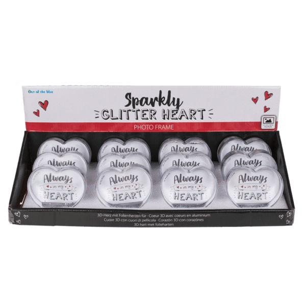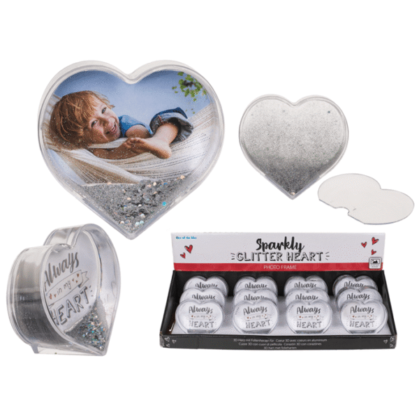 3D Acrylic heart water globe with heart foils, acrylic, for 1 photo 9 x 9 cm, 12 pcs. per display – This picture frame is the perfect way to showcase your favorite memories! The 3D photo frame can hold a picture of 9 x 9 cm and thanks to the glitter hearts you can add a little sparkle to your home. The heart shape is perfect for a photo of your special someone! Heart Globe
