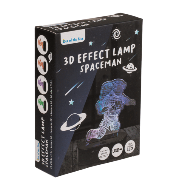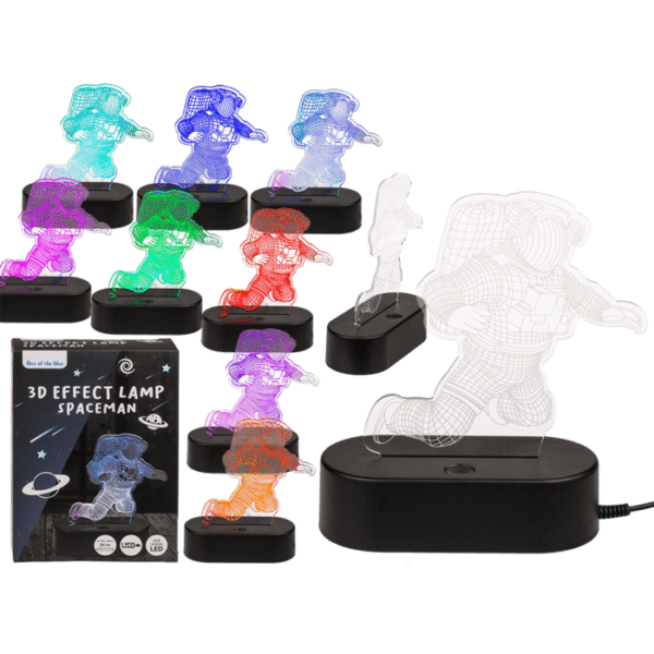 3D-Lamp, Spaceman, ca. 20 cm, with USB-cable plastic, in gift box – With this soothing night light in the shape of a Spaceman, you can create a wonderful atmosphere in your child’s room. The color-changing LED light allows the 3D figure to appear in an ideal light. The night light is powered by the provided USB cable. Space Lamp