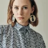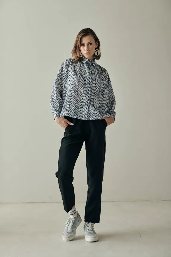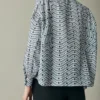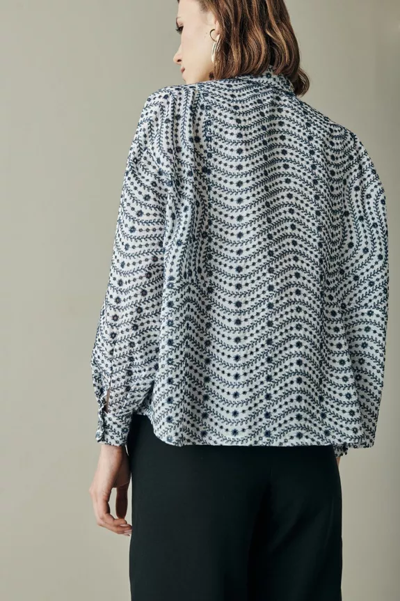 A wonderful shirt inspired by painter’s smocks, it’s an incredible piece for your fall wardrobe. Made from beautiful blue embroidered cotton, it’s the perfect piece for your work looks. Easily combined with our skirts and pants, it will give you an elegant and put-together look even in your most casual outfits.