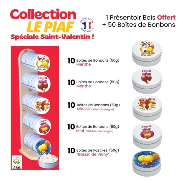 50 boxes of 50g illustrated with 5 different visuals featuring LE PIAF and loving hearts.