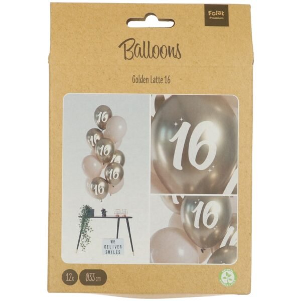 Balloons Golden Latte 16 Years 33cm – 12 pieces. Contents: 12 latex balloons. Colour: Gold. You can use this article for the following party occasion(s): Birthday and Anniversary. A latex balloon is 13 inch/33 cm. This article is made from latex.