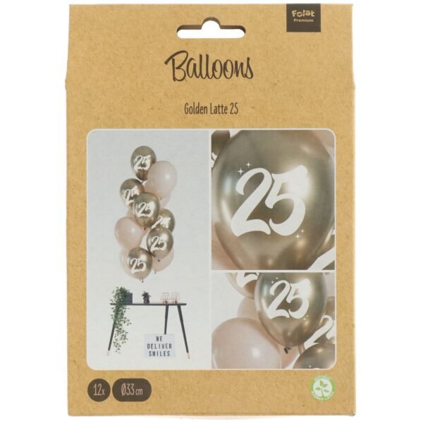 Balloons Golden Latte 25 Years 33cm – 12 pieces. Contents: 12 latex balloons. Colour: Gold. You can use this article for the following party occasion(s): Birthday and Anniversary. A latex balloon is 13 inch/33 cm. This article is made from latex.