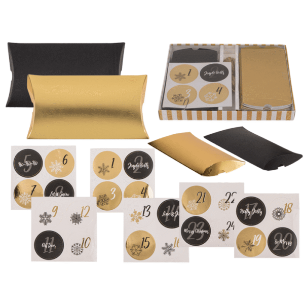 Blackgold colored advent calender, pillowboxes, ca. 12,5 x 7 x 1,5 cm, 2 colours assorted, including 24 stickers & 3,6m string – The pillow boxes are an incredibly good assistant if you want to give your loved ones a homemade advent calendar. The delivery also includes 24 number stickers and a 3.6 metre long ribbon. Of course you can decorate as much as you like! Advent calendar