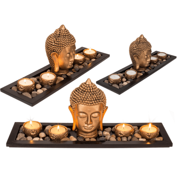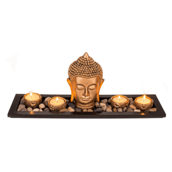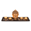 Black, rectangular wood plate, ca. 41 x 17 x 12 cm, with Buddha head & 4 candle holders made of polyresin, decorative stones & 4 tea lights, in gift box – Buddha plate