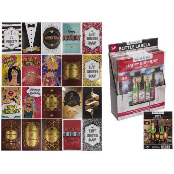 Bottle lables, Fancy, ca. 13 x 8 cm, 4 ass., set of 5 pcs. in polybag with header card, 24 sets per display – The bottle label fits perfectly on a glass bottle and personalises the gift for the birthday boy or girl while adding a touch of charm. Whether for birthdays or even as a Valentine’s Day gift, a single bag contains 5 sticker sets and is sure to have the right label for the right occasion! Each bottle label measures approx. 13 x 8 cm. Fancy labels