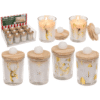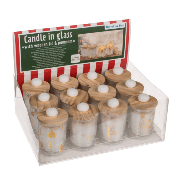 Candle in glass, with wooden lid & pompom, 5 x 6 cm, 4 assorted, 12 pcs. per display Festive candle