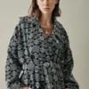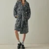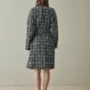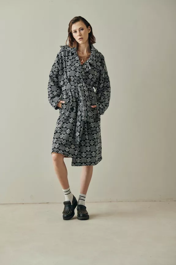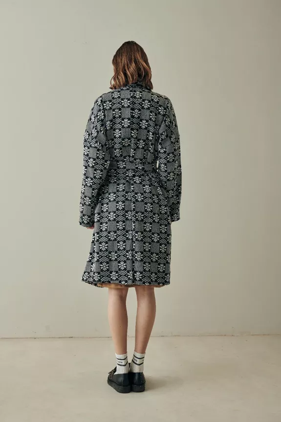 A wonderful coat with pockets, perfect for brightening up any drab day. Crafted in a beautiful two-tone black and white diamond jacquard, it’s warm, soft, and lightweight. Its retro feel makes it timeless and ideal. Buttoned with reclaimed vintage buttons and a matching belt, it’s a must-have.