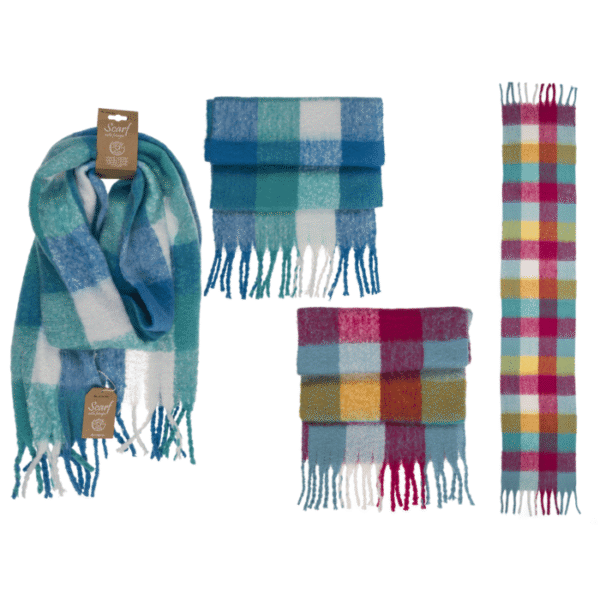 Checked fluffy scarf with tassels, 225g, 40 x 200 cm, 100% polyester, 2 colours assorted, 8 pcs per polybag, on header card – tassel scarffringe scarfpolyester scarfwinter scarflong scarf 55 x 180 cmassorted colours scarf packwholesale scarf 12 packwomen’s fringe scarfwinter gift scarfChristmas scarf