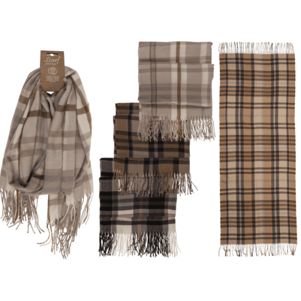 Checked scarf, Elegant, with tassels, 230g, 70 x 180 cm, 100% polyester, 3 colours assorted, 12 pcs per polybag – checked scarfplaid scarftassel scarfelegant winter scarfpolyester scarffringed shawllong wrap scarfchristmas gift scarfwomen’s fashion scarfwinter accessory