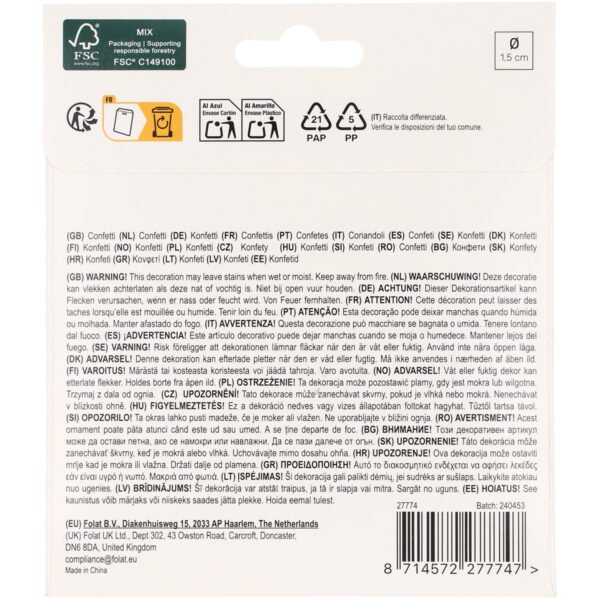 Sprinkle with party! Confetti – Stripetastic – 300 pieces. Contains: 14 gramms of confetti. You can use this article for the following party occasion(s): Children’s party