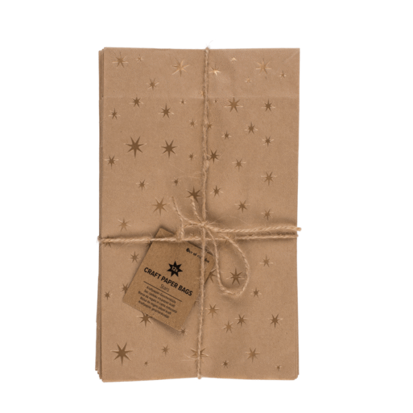 Craft paper bag, stars, ca. 20 x 12 x 6 cm, 12 pcs per Jute string and hangtag – These colourful paper bags have a flat base so they can be placed upright. Ideal for storing your cakes, sweets, biscuits and other treats. Also our paper bags are made of kraft paper and ist reusable and eco-friendly! Craft bag