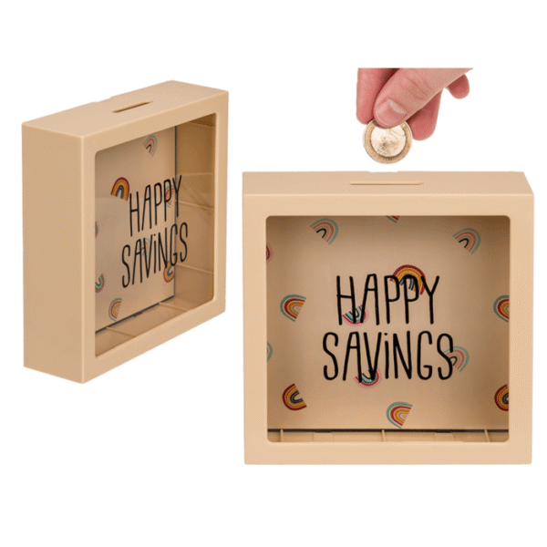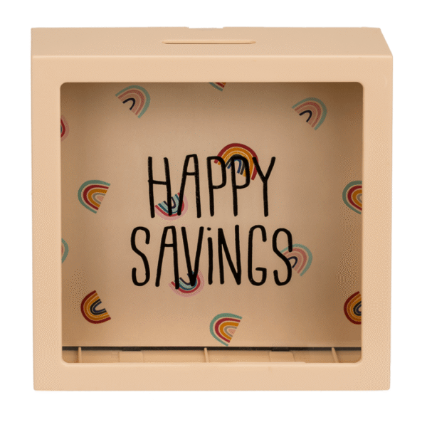 Cream coloured plastic saving box with rainbows, Happy Savings, ca. 15 cm, Money Box
