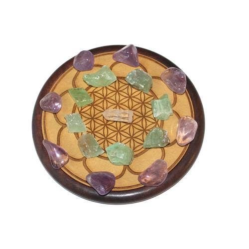 A Crystal grid is a structure in which you can place gems according to a certain set-up in relation to each other – the geometric pattern – so that they reinforce each other’s effect. Every gemstone has its own vibration frequency. There are different types of grids and therefore different set-ups that each serves a different purpose. Grids are used as a tool to manifest something beautiful. You can send the bundled energy of the stones that you need. Think of cleaning a room, healing, acquiring prosperity, love or help with border control. In this grid you will find an arrangement that contributes to healing. In addition, you will receive the set of gems that contribute to this intention: crystal, green calcite and amethyst.