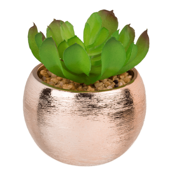 Decoration succulent in rosegold pot, ca. 8 x 10 cm, 3 ass. – These super pretty rosegold pots will fit perfectly in your home. The decorative succulents will make your living space look greener without you needing a green thumb! So you don’t have to remember to water the plants or put them in the sun. You can choose between 3 plants, all with the same modern looking pot. Succulent plant