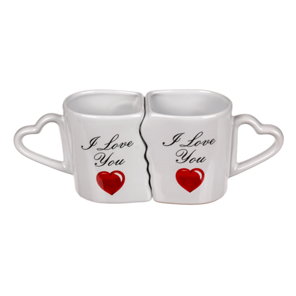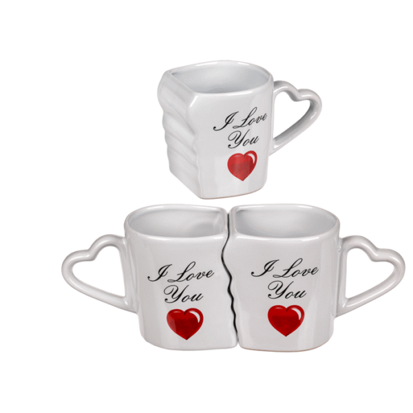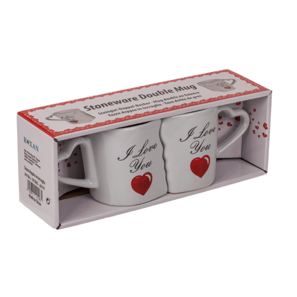 Double mug, I love you, approx. 8, 5 x 9 cm, stoneware, set of 2 in gift box with window – With the white coloured stoneware mugs, morning coffee becomes a romantic experience. When the cups are put together, they complement each other perfectly. In addition, the cups have a unique heart handle. Due to their gift packaging, the cups are also suitable as souvenirs at weddings or birthdays. Each of the two cups have a filling capacity of ca. 240 ml and are dishwasher safe. Double mug