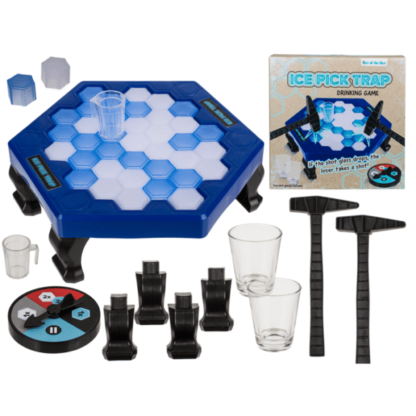 Drinking Game, Ice Pick Trap, 49 pcs set, approx. 22 cm, plastic – The icebreaker for every party night! You have a turntable and have to knock out the ice floes indicated on the turntable while trying to keep the glass on the playing field. As soon as the shot glass on the ice floe falls, the game is over and the loser has to drink a shot! The shots can be drunk directly from the glasses that are included in the package! Party Game