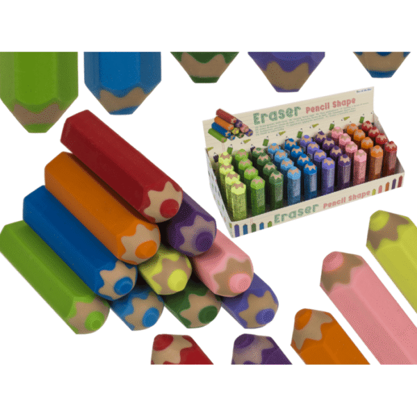 Eraser, Pencil shape, 6,6 cm, Eraser Pencil-shaped Assorted colors Stationery Display School supplies Correction tool Writing accessory Small size Classroom essential