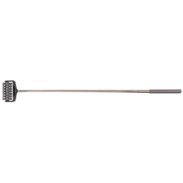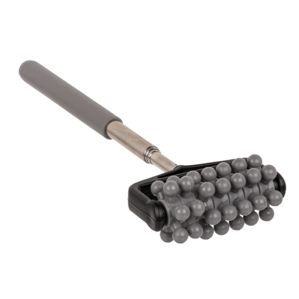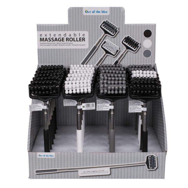Extendable massage roller with rubber handle, ca. 51 cm, 3 colours ass., 24 pcs. per display – With the extendable massage roller, you can massage your own back independently of others. The roller is ideal for relieving tension and stimulating blood circulation. The massage roller is also suitable for other parts of the body, such as arms and legs. Massage roller