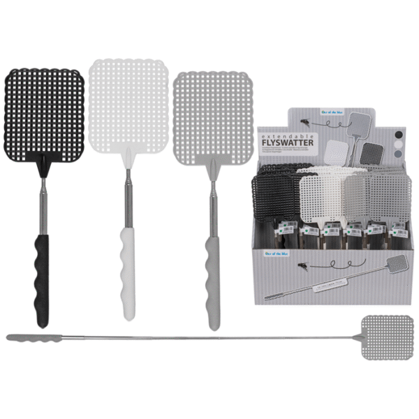 Extendable Plastic Swatter, ca. 73 cm, 3 colours ass., 24 pcs. per display – The fly swatter is a classic among insect eliminators. With our fly swatter you can target your uninvited guests and after a successful hit you can also easily clean the swatter. The fly swatter is even extendable to have a higher defence surface. The handle is made of plastic and is comfortable to hold. Extendable Swatter