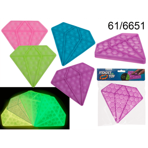 Fidget Pop Toy, Diamond, Glow in the Dark, 4 colours asstd., Silicone, approx. 17 x 15,2 x 1,5 cm – Fidget Pop Toy is the new trend that is taking over the world. Bubble wrap has always had us in its grip and now you can pop bubbles endlessly, the thing we’ve always needed without knowing it. The soft, smooth silicone is comfortable and popping bubbles is not only satisfying, but also relieves stress and calms the mind. This pop toy even glows in the dark! Fidget toy