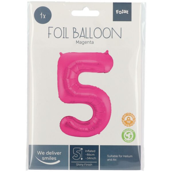 5 Shaped Number Balloon Magenta – 86 cm. Contents: 1 Foil Balloon. Colour: Magenta. You can use this article for the following party occasion(s): Birthday