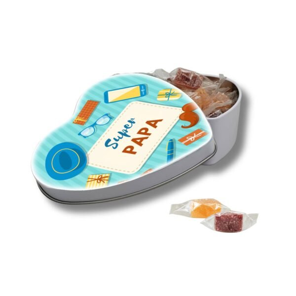 A heart-shaped metal box, with an elegant and masculine design, proudly bearing the inscription “Super Papa”. Inside, 120g of artisanal fruit jellies from Cruzilles, a French house renowned for its excellence.