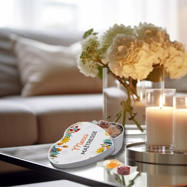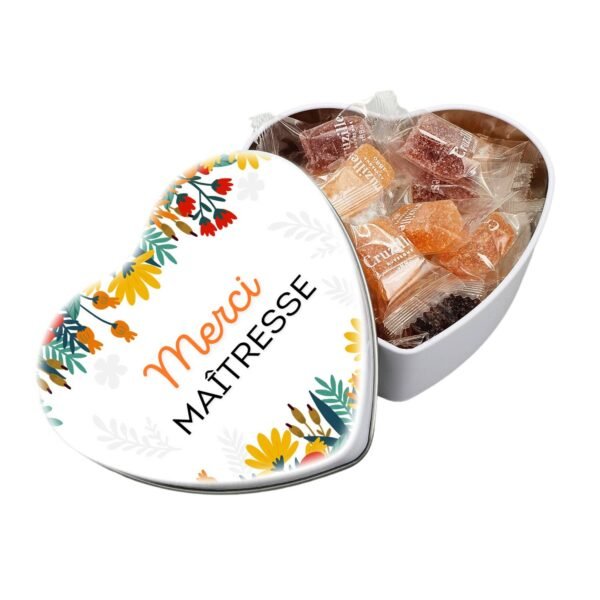 To close the school year with tenderness, this heart-shaped metal box is the perfect gift. Adorned with the inscription “Merci Matresse”, it contains 120g of artisanal fruit jellies from Cruzilles, a French house recognized for its know-how.