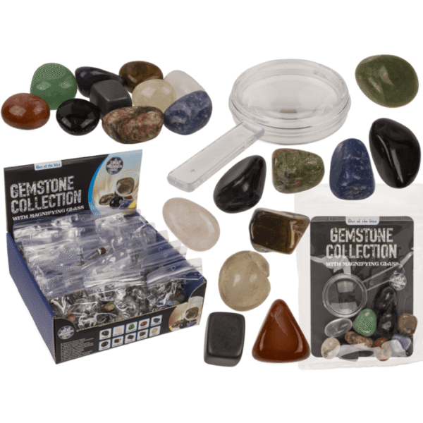 Gemstone set, Gemstone Collection, 11 pcs. (10 gemstones + magnifying glas) per set, with explanation booklet, 36 pcs per display – pyrite stones fools gold pirate gold party favors pyrite gift set velvet pouch stones bulk pyrite display natural mineral decor crystal party favors geology classroom supplies raw mineral specimens