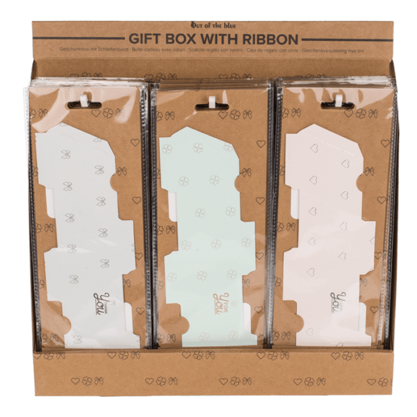 Gift box with ribbon, ca. 6 x 8,5 cm, 3 ass., 36 pcs per display, 24 pcs as refill – Smaller items, such as jewellery, are always difficult to wrap. The ideal solution to such a problem are, for example, these small gift boxes! The coloured boxes can be easily folded together and closed through the provided ribbon. This way you can put a necklace in the box without being afraid that it will open. Ribbon gift box