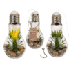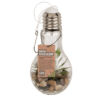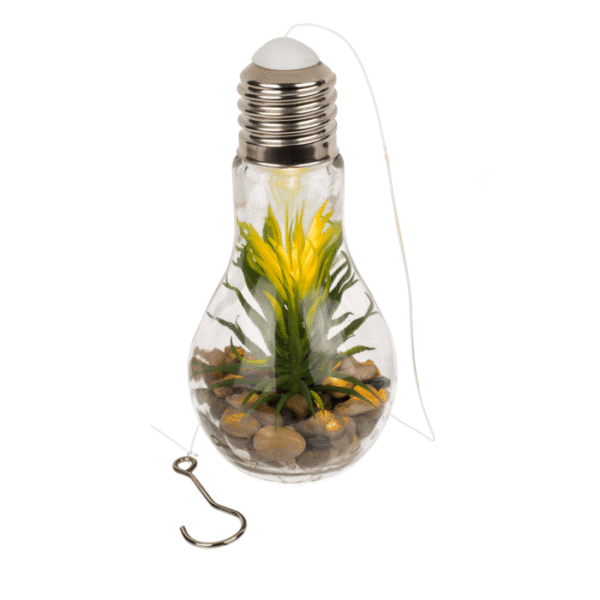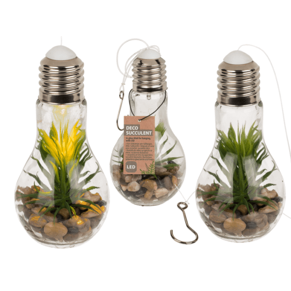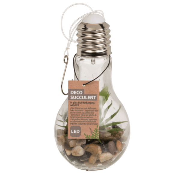 Glass bulb for hanging, Decoration succulent & LED (incl. battery), aprox.. 5 x 19 cm – Still looking for cosy lighting but at the same time a beautiful decoration? This LED not only gives light, but also makes your room a little greener! The glass light bulb has a thread with a metal hook to hang it freely in your home. The bulb contains stones and a decorative plant. The plant is surrounded by a very thin string of lights with warm white LEDs. These LEDs run on battery power. This has the advantage that you can put them wherever you want and don’t need a power socket. Hanging bulb