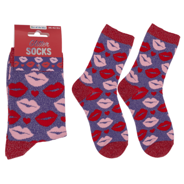 Glitter socks, kissing mouth, size 36-42, 55% cotton, 43% polyester, 2% elasthan, with headercard, 12 pair in polybag – glitter socks sparkle socks sequin socks