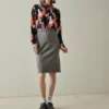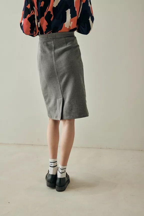 Elegant below-the-knee pencil skirt in a subtle gray color that will be the perfect base for many of your looks this season. Closed with a side zipper and a recycled vintage button at the waistband, it’s made from an incredibly soft and comfortable fabric. Very warm, versatile, and easy to care for.