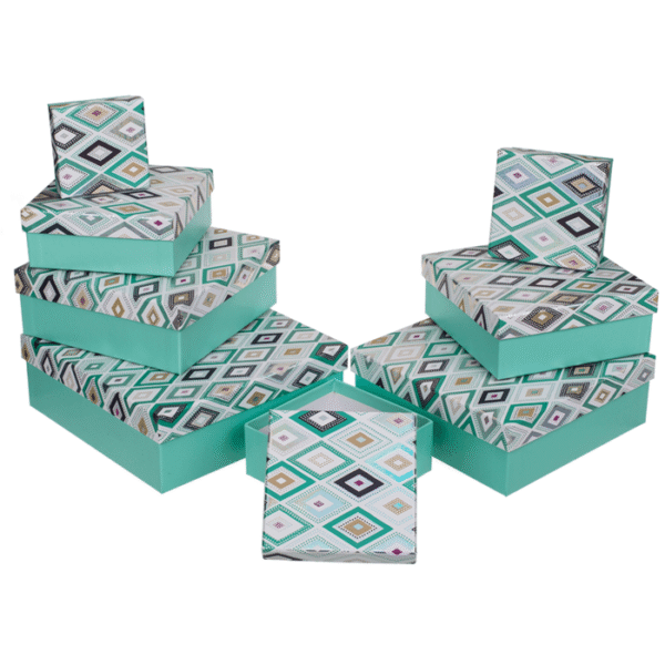 Green gift box with hash pattern, aprox. 22,5 x 22,5 x 8 cm, Set of 8, individual EAN codes – The gift boxes allows you to wrap a gift in a split second and it also looks simple and lovely, thanks to the multi coloured lid! This set consists of 8 green coloured boxes in different sizes. The boxes with the hash pattern can also be utilized ideally as storage space for your most important utensils and can therefore be used repeatedly. In addition, the boxes can be further designed as desired and are therefore the ideal basis for DIY gifts. Green gift box