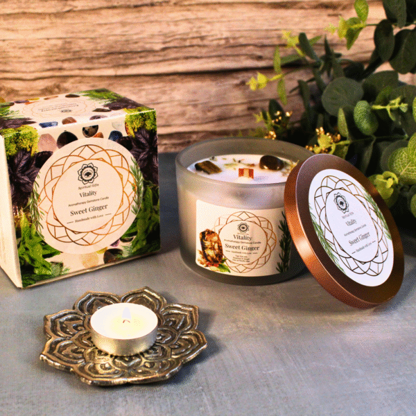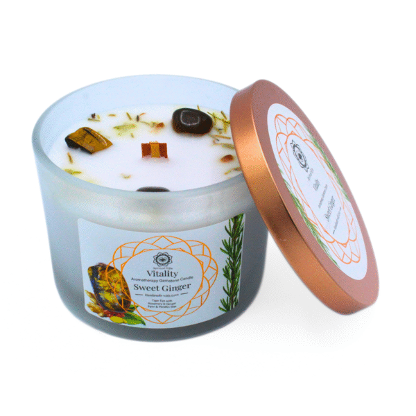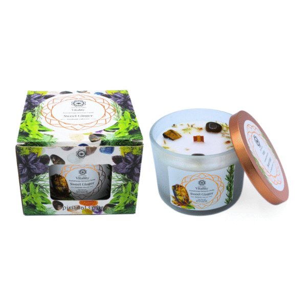 Spicy-sweet ginger in organic vegan soy wax, paired with energizing gemstones — perfect for cozy Autumn vibes and festive warmth.