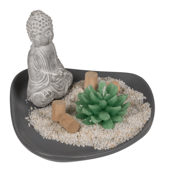 Grey coloured wooden plate, ca. 20 x 16 cm, with cement buddha, deco sand, cactus candle & wooden deco sticks, in giftbox – Buddha figures are much more than just decorative objects. They stand for enlightenment, meditation and focus. This calming set contains a black wooden plate with a grey coloured Buddha figure with decorative sand, sticks and a green cactus shaped candle. The set is a very nice decoration that fits super in the bathroom to create a cozy atmosphere there. Boho decor