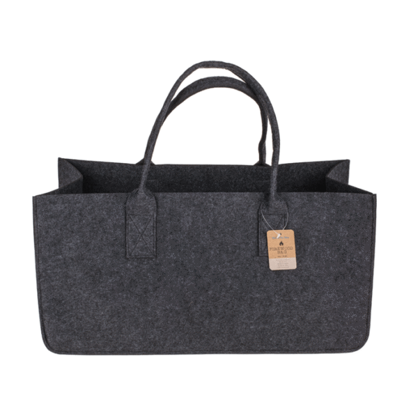 Grey felt bag for wood, ca. 50 x 25 cm, 100% polyester, 2 colors ass., filling capacity max.15 kg, 8 pcs. per polybag – The sturdy firewood bag made of polyester is a nice way to transport and store your firewood. The bag can withstand a maximum weight of 15 kilograms and can be carried comfortably thanks to the handles. The grey-coloured bag can also be used for other purposes besides firewood, offering plenty of space for your shopping. Felt bag