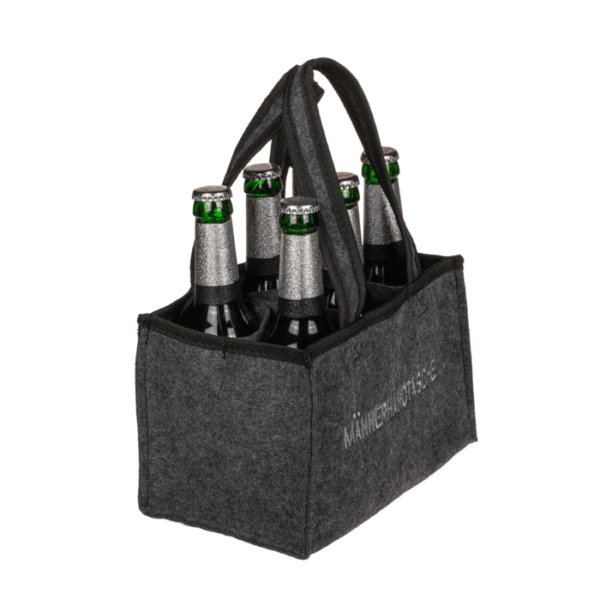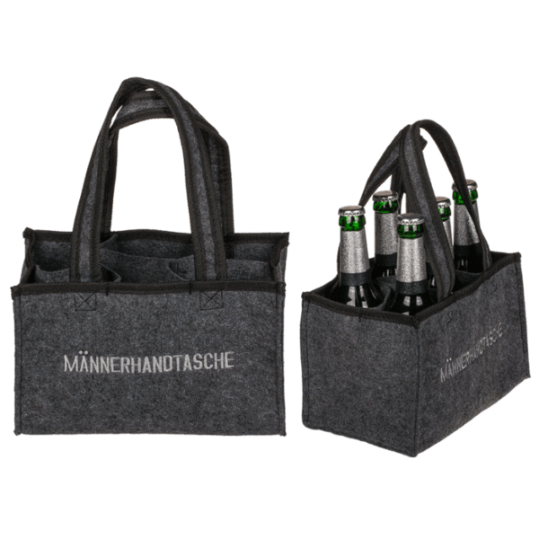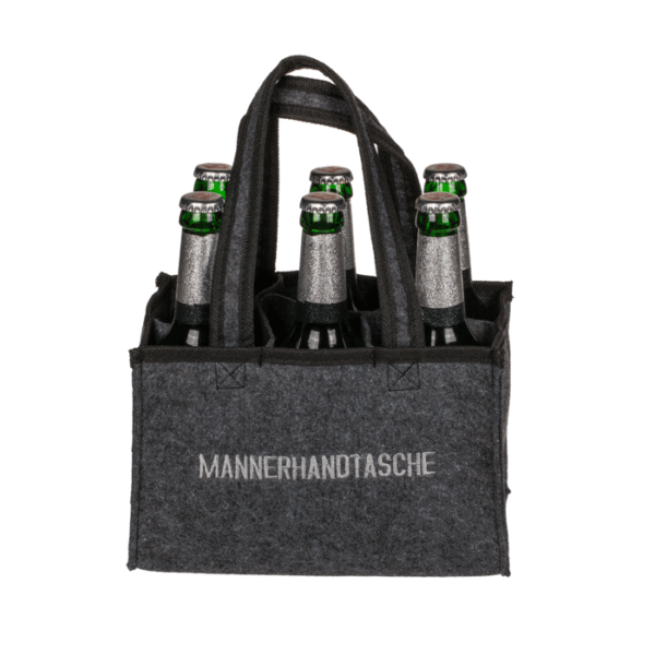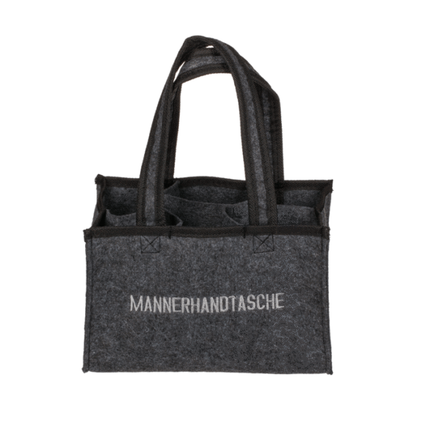 Grey felt bag, Männerhandtasche, with 6 boxes, ca. 24 x 15 cm, felt – This handbag is just the right thing for men to carry drinks. Especially suitable for the park and the beach. In addition, the bag can be used universally. The handbag made of felt comes in the colour grey with the inscription “Männerhandtasche” in capital letters. The trendy beer carrier for 6 bottles with carrying straps is suitable for 0.5 litre bottles and has a size of approx. 24 x 15 cm. Bottle carrier