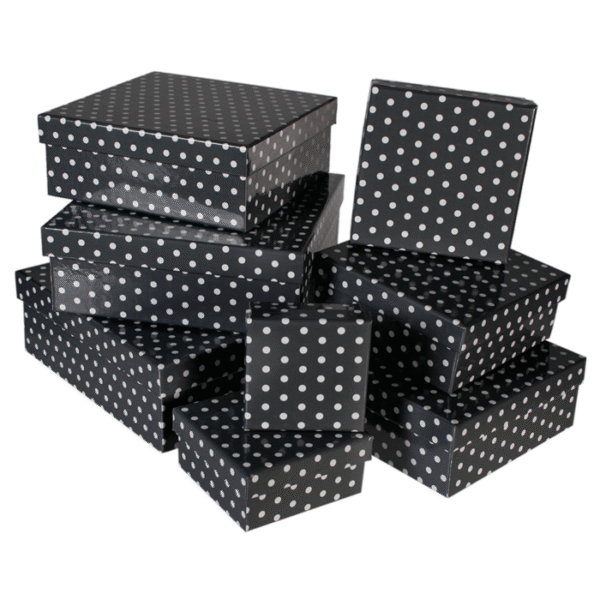 Grey gift boxes with white dots, ca. 22, 5 x 22, 5 x 8 cm, set of 8, individual EAN codes – The gift boxes allows you to wrap a gift in a split second and it also looks simple and elegant! This set consists of 8 grey coloured boxes in different sizes. The boxes with the white dots can also be utilized ideally as storage space and can therefore be used repeatedly. Thanks to the elegant colour, the packaging suits just about any occasion. Grey gift