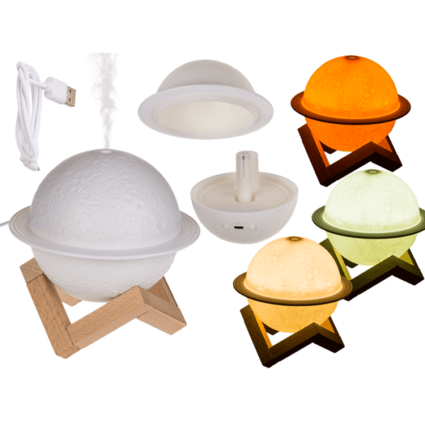 Humidifier/oil diffuser, planet, with wooden rack, 3 lighting levels & USB cable, for ca.110 ml, ca. 13,8 x 10,5 cm, plastic, in gift box – Aromatherapy