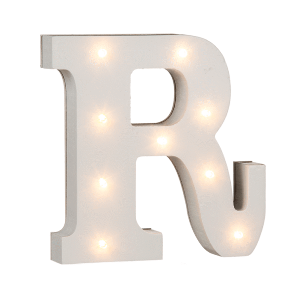 Illuminated wooden letter R, with 9 LED, ca. 16 cm, for 2 micro batteries (AAA) – The illuminated letters let you choose the way you like to decorate them! With the letters you can add your own individuality and personal touch. Whether names, places or words. The letters can be arranged over and over again and thanks to the 9 LEDs, the wooden decorations provide a romantic indirect light. The home accessories are powered by 2 AAA batteries and are operated with the help of an on/off button. In particular, the letters are ideal for the names of a bride and groom for their wedding. Decorative letter