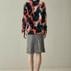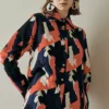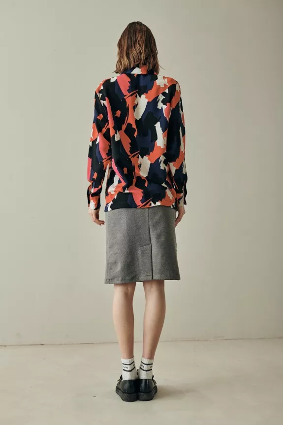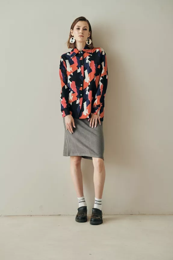 Simple, practical-cut shirt in relaxed viscose with a graphic print in fuchsia, white, and black. Its wide collar adds presence and its stud buttons are sustainably and locally made in Barcelona. Wear it for special occasions with a skirt and dress shoes or heels, and dress it up for everyday wear with trousers and flat boots or sneakers.