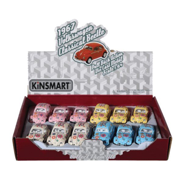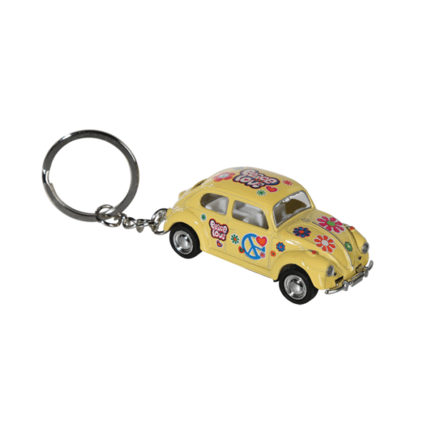 Keychain, model car with pull back, VW Beetle 1967 – Flower Power, metal with plastic, ca. 6, 5 cm, 4 colours ass., 12 pcs per display – Our keychain is the perfect size to keep in your pocket! The Mini VW Beetle has a pull-back motor to help you have fun on the road! The pendant is made of metal with plastic details and decorated with hearts and flowers. The model car is perfect for collectors and lovers of the old VW! Keychain