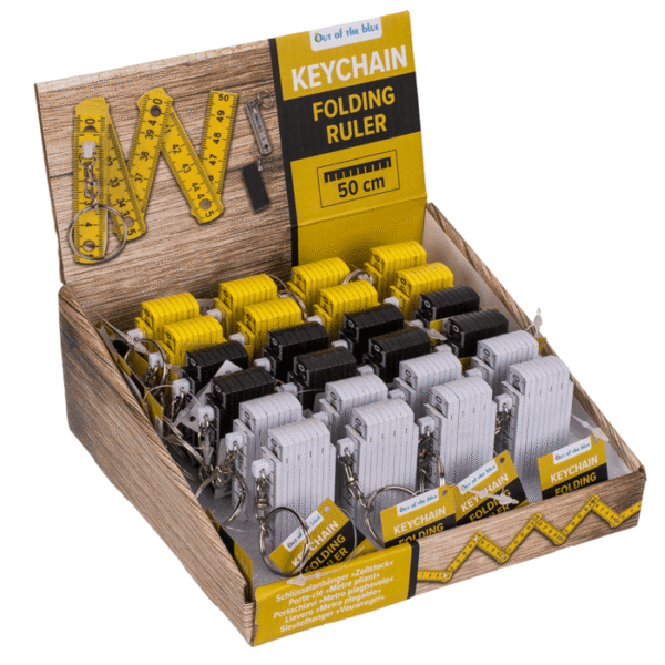 Keychain, Plastic Folding Ruler, L: 50 cm, 3 colours ass., 24 pcs per display – With this practical keychain you won’t have to guess any lengths anymore! You’ll always have a folding rule on your key ring that can be extended up to 50 cm. The folding rule will help you to keep track of your building projects better and easier. Keychain