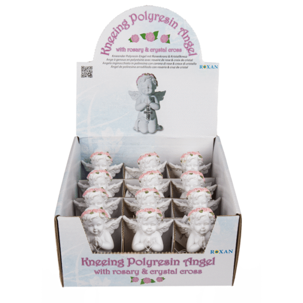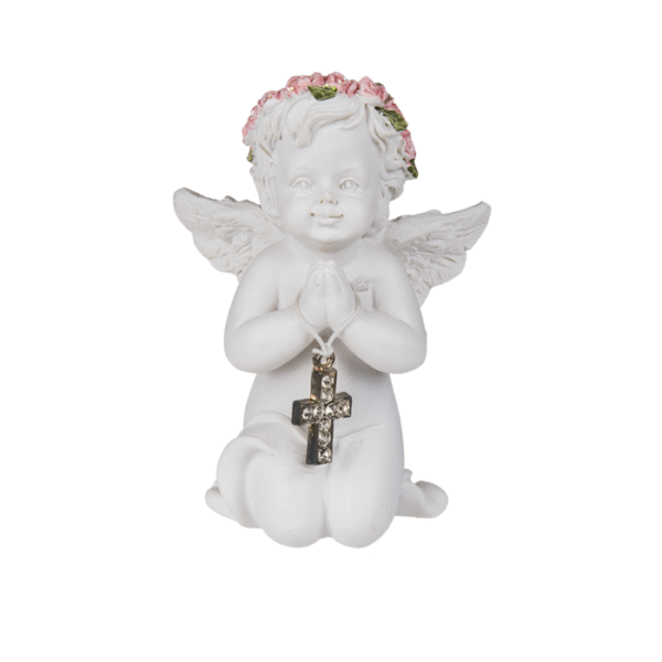 Kneeling polyresin angel with pink coloured rosary & silver coloured crystal cross, ca.7 x 5 cm, 12 pcs. per display – The lovingly designed angel figurines exude a calm and secure feeling, which come into their own excellently as a decorative element. The gently kneeling angel with the pink rosary holds a crystal cross in his hand, with which the angel turns out to be a loving decoration for memorials. Angel figurine