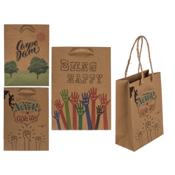 Kraft paper bag, motivational wordings, ca. 11,5 x 6 x 16 cm, 3 ass., 12 pcs. per polybag – A gift is only perfect when it has been thought through to the last detail. Even down to the gift wrapping! With a gift bag you therefore have the perfect detail and wrap the gift in a split second. Not only are they an incredibly quick solution for those who are not that good at wrapping gifts, they can also be reused as often as you like! The craft paper bags feature string handles that make the gift easy to transport. Thanks to the material, you even use sustainable wrapping products! Kraft bag