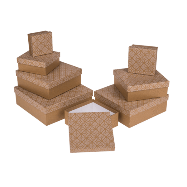 Kraft paper gift box, with floral ornament, ca. 22,5 x 22,5 x 8 cm, set of 8 – The gift boxes allows you to wrap a gift in a split second and it also looks simple and elegant! This set consists of 8 boxes in different sizes. The boxes can also be utilized ideally as storage space and can therefore be used repeatedly. Thanks to the plain colour, the packaging suits just about any occasion. Kraft box