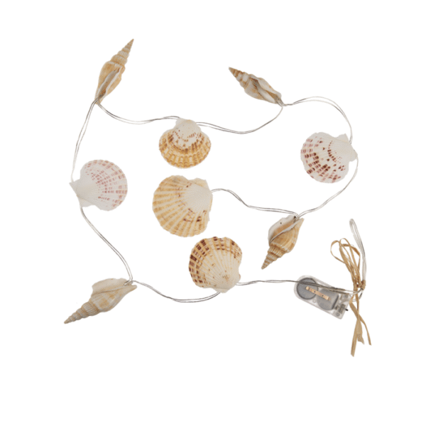 Light chain garland, shells, with 9 warmwhite LED(incl. batteries) L: ca. 1, 1 m , in polybag with headercard, for indoor use only – The light chain is a great, indirect lighting and creates a pretty light accent in your living rooms. The light chain can be used independently of access to a socket, because it is operated with 2 button cells. It is switched on and off at the battery compartment. The light chain is only suitable for indoor use. Shell garland