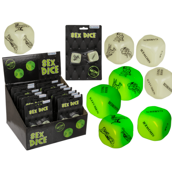 Love dice, Kamasutra, glow in the dark, set of 2 per blister card, 24 pieces per display – The glow-in-the-dark love cubes are ideal for bringing a new breeze into your love life! Roll the dice and perform the specified message and continue to be excited about the next task. With the dice, you will no longer be bored and you will have a lot to enjoy. Sensual Dice