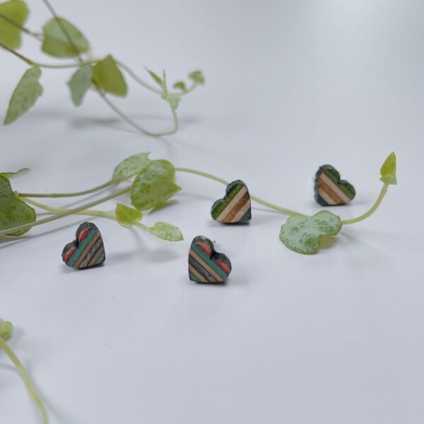The details are not insignificant, they make the design. The colourful layers from the skateboard give our Love Hear Recycled Skateboard Wooden Stud Earrings their own distinguished look. Each pair is unique as the colour will always different.