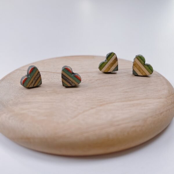 Our Love Heart Recycled Skateboard Wooden Stud Earrings are handcrafted by a skater who is also passionate about upcycling and environment issue. He has seen many old and broken boards thrown away, so he started to collect them from other skaters, and now uses his craftsmanship to give the skateboards a second life. The Love heart earrings are carefully cut out from the skateboard, polished and cleaned to showcase the beauty of the original skateboard deck.